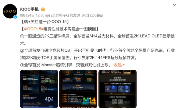 iQOO 15也将在10月份与大家见面,这一次的性能旗舰将电竞性能推向新高度,iQOO 15全球首发自研电竞芯片Q3,开启手机显卡时代,行业首个落地全场景自研光追,支持2K超分TOP手游全覆盖与2K 144FPS超分超帧并发。屏显层面,搭载2K三星珠峰屏,全球首发M14发光材料与2K LEAD OLED显示技术,画面通透细腻,配合Monster超核引擎,突破游戏性能上限,体验极致电竞。